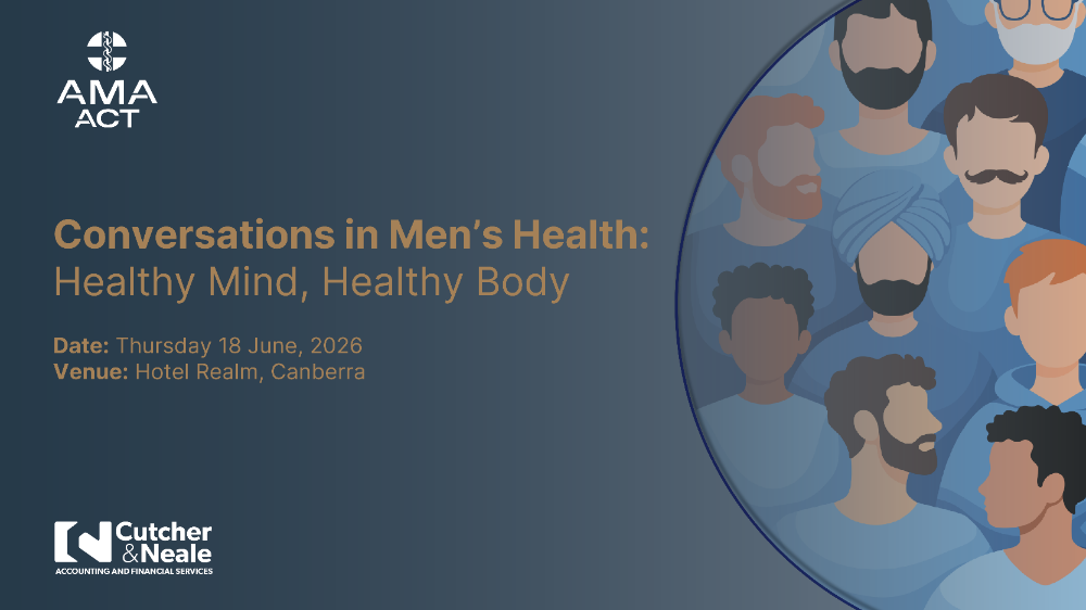 Conversations in Men’s Health: Healthy Mind, Healthy Body brings together doctors and thought-leaders for an open, honest and engaging panel discussion focused on the realities of men’s health today. Hosted by newly inaugurated AMA ACT President, Dr Betty Ge, the evening will cut through the statistics and stigma to explore how mental and physical health intersect, why men often delay seeking help, and what clinicians and communities can do to support better outcomes.